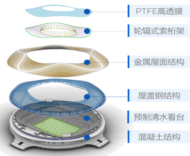 體育場屋蓋結(jié)構(gòu)由鋼結(jié)構(gòu)索膜結(jié)構(gòu)和金屬屋面組成,形成了平面投影為中央開孔的高60米、直徑約280米的圓形,屋頂沿環(huán)向呈波浪起伏狀,是世界首個平面單層膜輪輻式索膜結(jié)構(gòu)體系,也是國內(nèi)首例專業(yè)足球場大規(guī)模應(yīng)用高透光率PTFE網(wǎng)格膜材料。