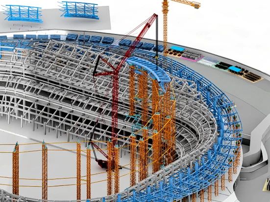 屋蓋鋼結(jié)構(gòu)共包含88榀桁架,單榀鋼桁架重約200噸,起吊高度超60米,相當于將一頭成年藍鯨提升20層樓,且精度要求在5毫米以內(nèi),對于構(gòu)件強度與吊裝精度都提出了較大挑戰(zhàn)。項目聯(lián)合重慶大學(xué)周緒紅院士團隊,共同研發(fā)“大型復(fù)雜鋼結(jié)構(gòu)全過程一體化數(shù)字建造技術(shù)”,對吊裝段進行激光掃描和視覺重建,基于點云數(shù)據(jù)智能處理算法,自動生成多尺度尺寸檢測報告,并提前進行相鄰節(jié)段的虛擬預(yù)拼裝,為后續(xù)節(jié)段的動態(tài)糾偏提供數(shù)據(jù)支撐,全面提升場館建造品質(zhì)。
