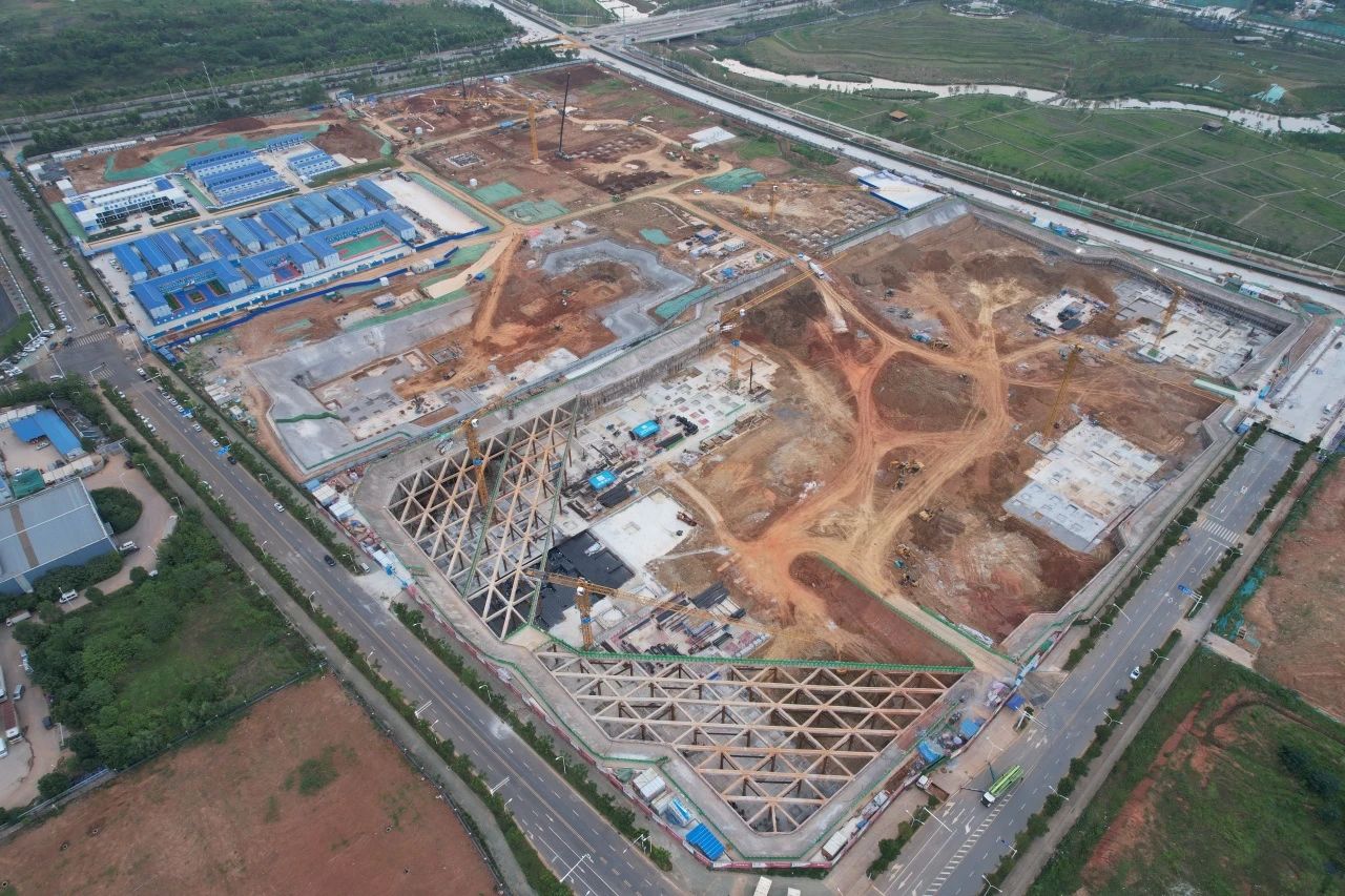 項(xiàng)目施工面臨“大、高、多”等困難,其中,地下室深基坑局部三層,接近總建筑面積的50%,高支模最高14.4米,且超危大工程高支模區(qū)域達(dá)28處。項(xiàng)目精心組織施工,科學(xué)安排生產(chǎn),采取平行施工的方式,克服基坑階段場區(qū)道路狹窄等困難,完成約70萬m3土方開挖和模板支護(hù)、拆撐。