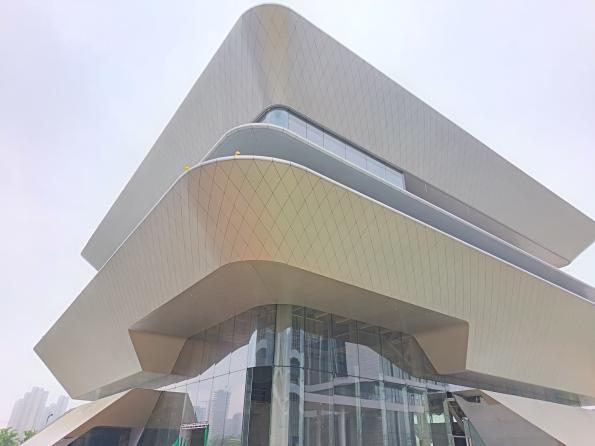 項(xiàng)目綜合樓外立面為“山峰”造型設(shè)計(jì),包含豎明橫隱玻璃幕墻、全玻幕墻、開縫鋁板幕墻、玻璃欄板4種幕墻系統(tǒng),采用5系進(jìn)口陽極氧化鋁板,涂層厚度超15μm,具有極強(qiáng)耐腐蝕性,鋁板超20年不褪色;外立面菱形蜂窩板塊合計(jì)10228塊,四個(gè)轉(zhuǎn)角為雙曲蜂窩板,雙曲作業(yè)面超30%,以直線型、出挑、倒圓角等設(shè)計(jì)手法,塑造動(dòng)感、理性、簡約的建筑造型。