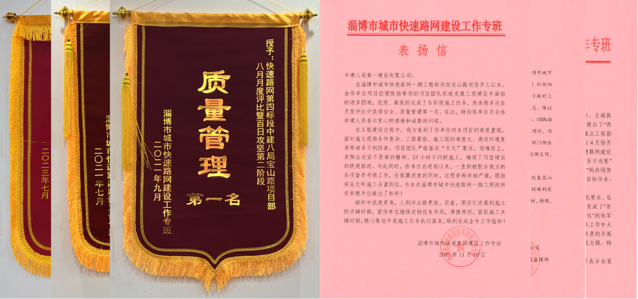 累計迎接中國市政工程協(xié)會等大型觀摩交流50余次,在業(yè)主組織的勞動競賽和表彰大會中獲得安全管理、質(zhì)量管理第一名、“施工突出貢獻(xiàn)單位”等榮譽,累計收獲20余封表揚信和錦旗。