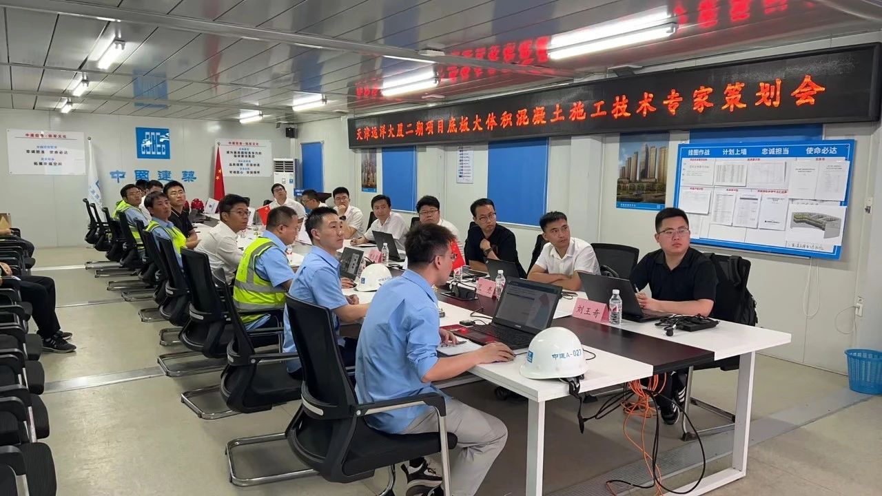 針對3.2米超厚底板,協(xié)調(diào)組織經(jīng)驗豐富的專家團隊實地勘察現(xiàn)場進行技術(shù)策劃,提出支撐梁掛設(shè)無動力溜管澆筑法優(yōu)化建議,積極協(xié)同相關(guān)參建方開展基礎(chǔ)底板施工方案論證會,針對鋼筋支架、混凝土配合比試配,水化熱驗算、溫差控制與混凝土養(yǎng)護等全過程進行細致梳理,為項目大體積混凝土澆筑掃清障礙。