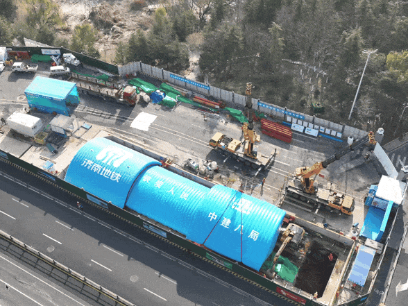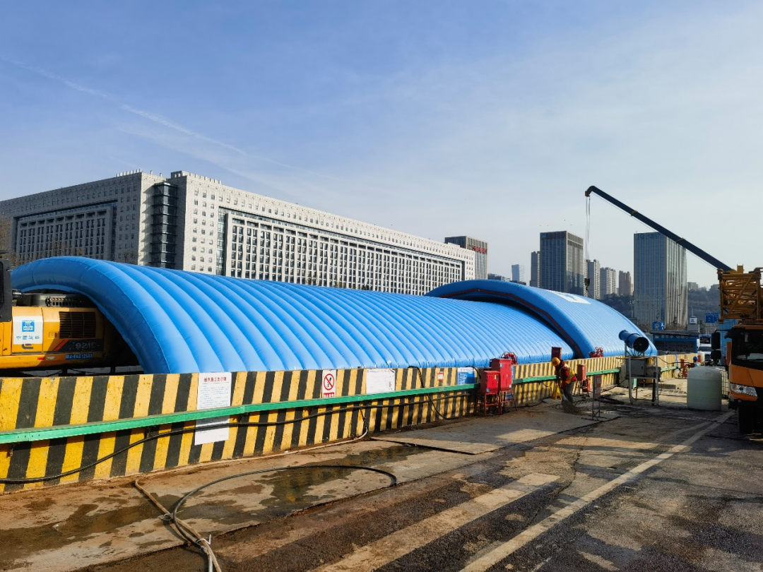 濟(jì)南軌道交通7號(hào)線(xiàn)的滑移型氣肋式基坑氣膜屬全國(guó)首例,也是基坑氣膜在地鐵項(xiàng)目的首次應(yīng)用。通過(guò)安裝高強(qiáng)度、高耐久性、防火性能好的充氣膜材料,向膜內(nèi)充氣,在工地上方形成一個(gè)密閉的空間,具有良好的隔音和防塵性能,同時(shí)還能保溫、防雨雪,改善冬季施工環(huán)境,給建設(shè)者們提供更好的施工條件。