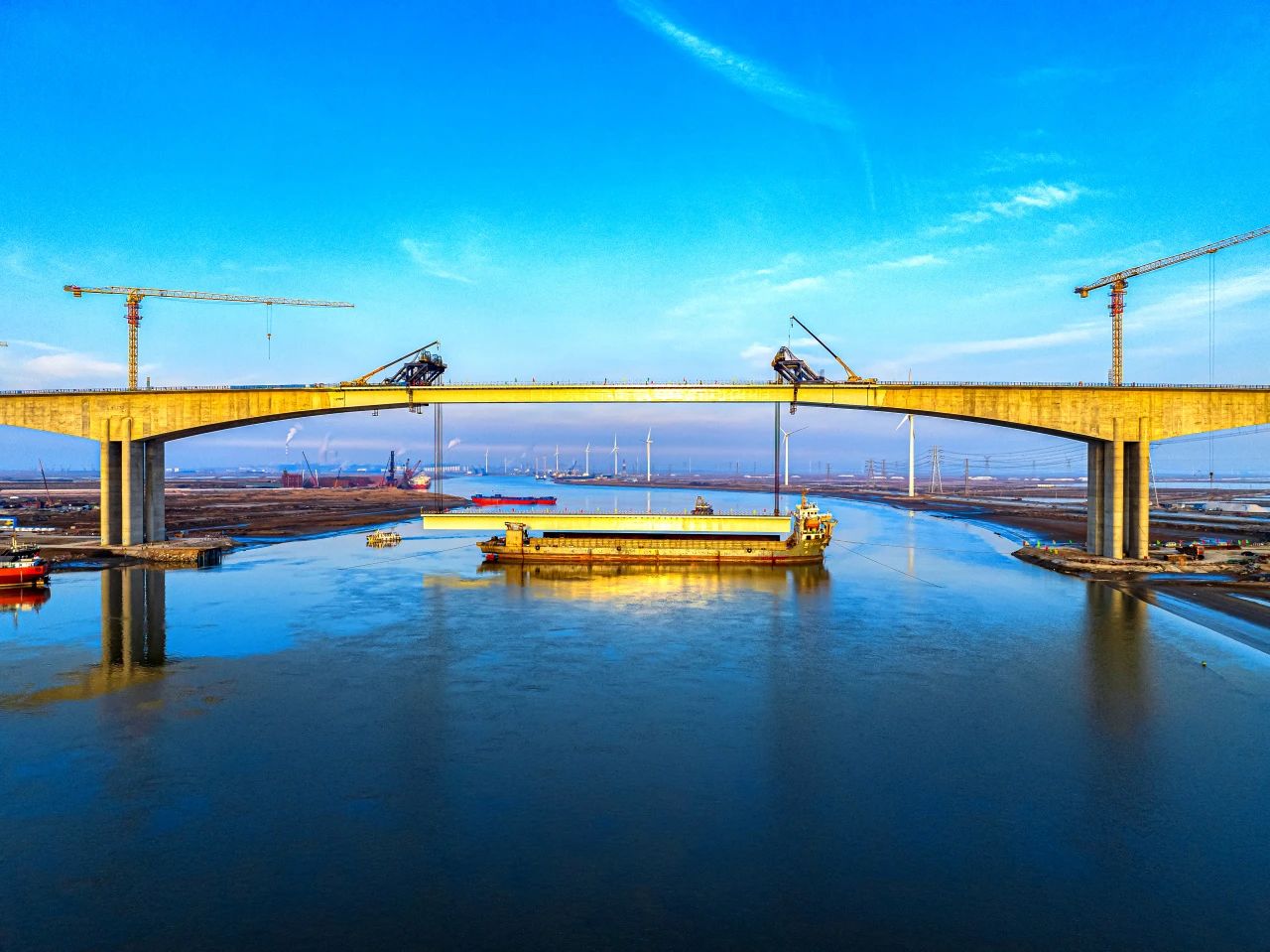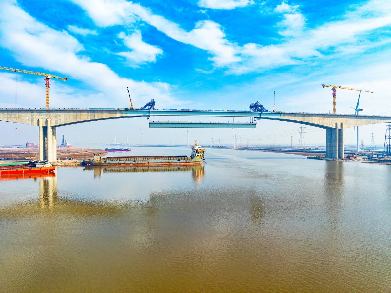 一橋飛架,跨越山海,天塹變通途.近日,隨著千噸級(jí)箱梁精準(zhǔn)吊裝到位,中建八局投資建設(shè)運(yùn)營的G228丹東線濱州段項(xiàng)目世界第一跨徑混合梁橋套爾河特大橋正式合龍,刷新一項(xiàng)新的世界紀(jì)錄。