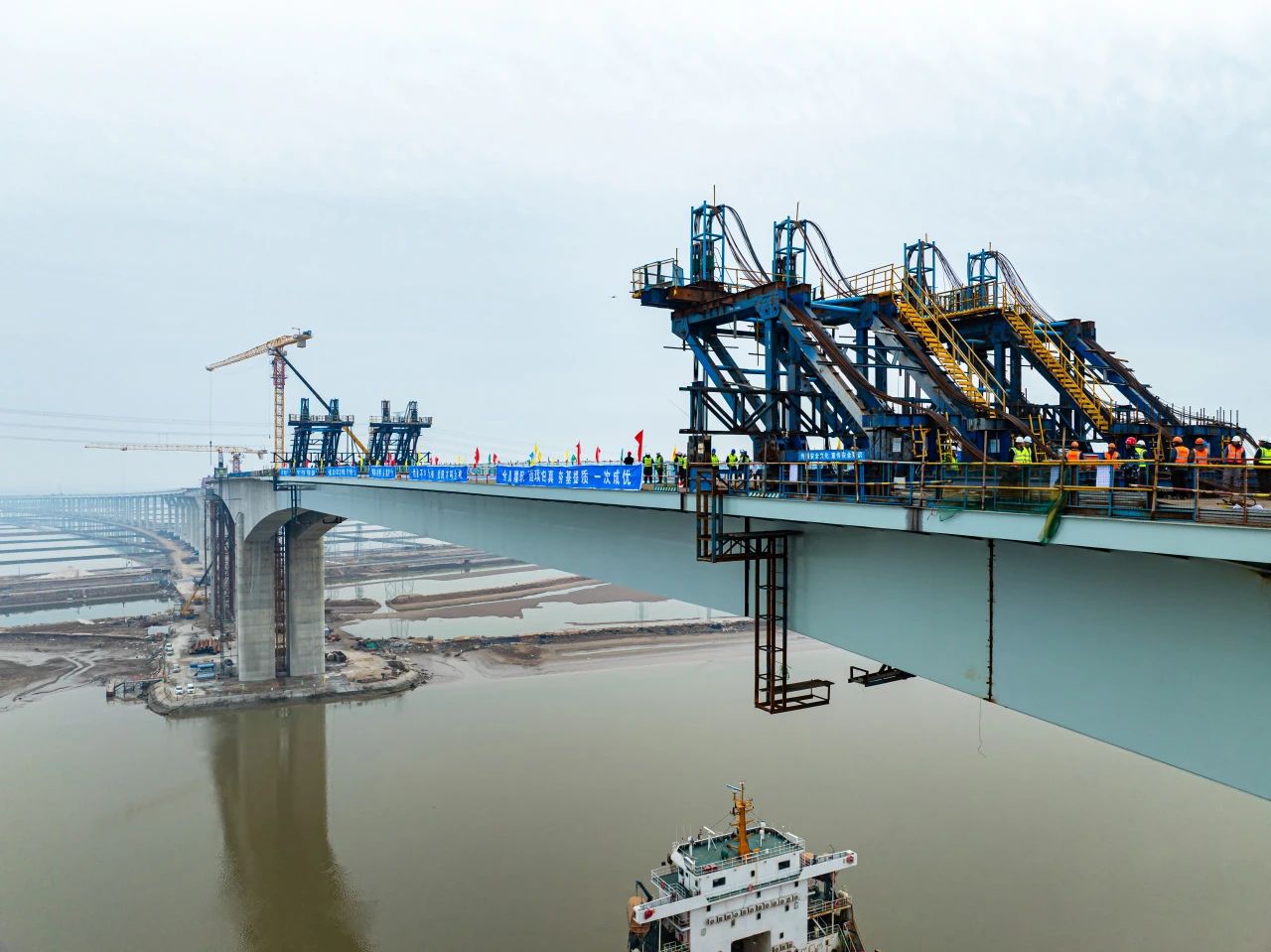 自2022年開始施工以來,項(xiàng)目團(tuán)隊(duì)充分發(fā)揚(yáng)鐵軍精神,在大風(fēng)、高鹽、潮汐、凍融等環(huán)境中完成105米超長灌注樁、4488方大體積承臺(tái)、42米超高墩柱、17米高0#塊370噸懸臂澆筑、1200噸鋼梁吊裝等30余項(xiàng)關(guān)鍵節(jié)點(diǎn),推動(dòng)“世界第一跨”朝通車目標(biāo)穩(wěn)步前進(jìn)。