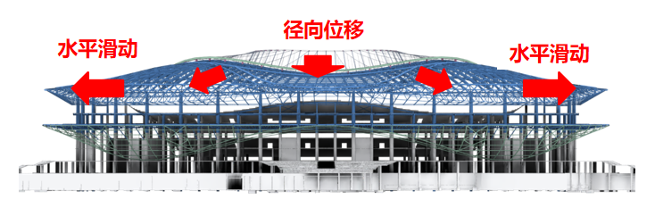 項目屋蓋鋼結(jié)構(gòu)通過滑動支座與下部36根排架柱焊接固定,卸載過程支座會產(chǎn)生水平滑動,對卸載精度將產(chǎn)生影響。項目聯(lián)合重慶大學科研團隊研發(fā)“正向施工過程分析和反向迭代計算”,為鋼結(jié)構(gòu)施工預變形分析提供算法支撐,成功將滑動支座安裝精度控制在±30mm內(nèi)。