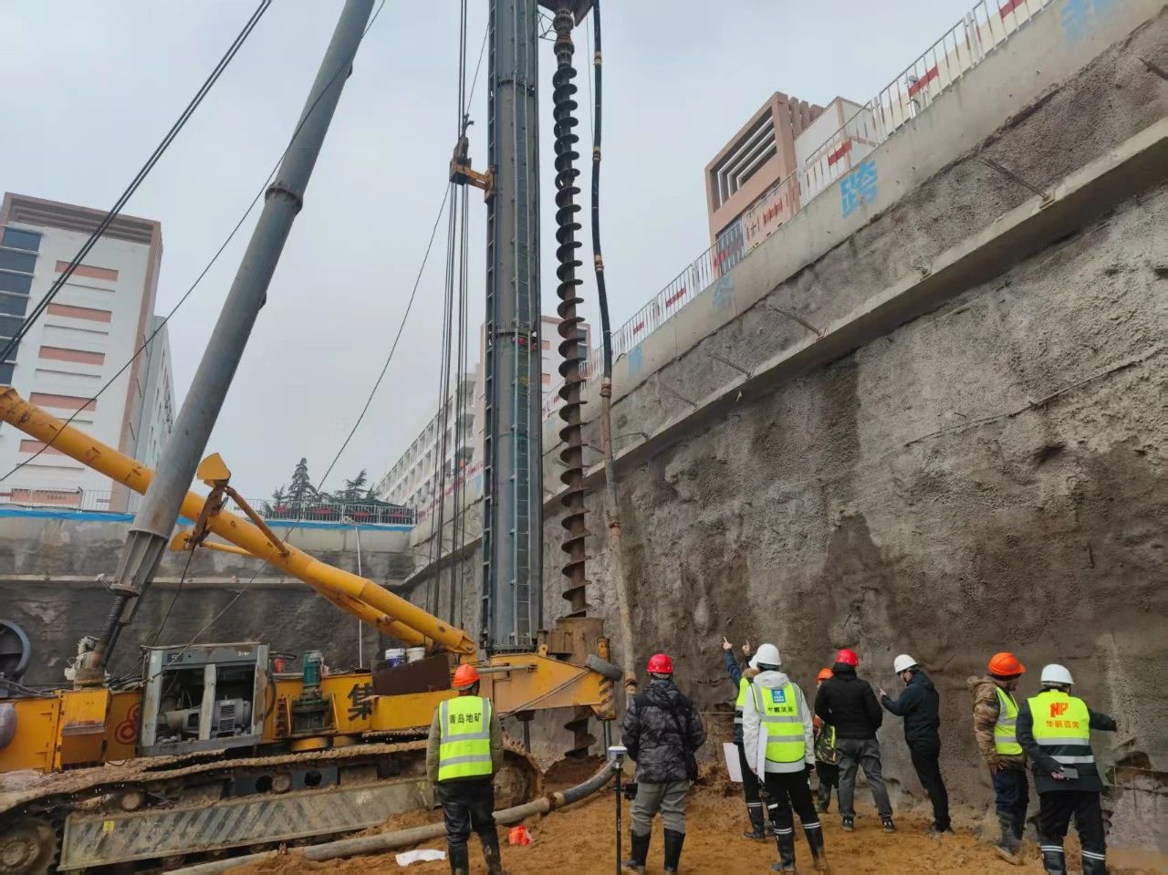 項目地下水情況復(fù)雜,工程樁成樁困難,項目組織專家論證及現(xiàn)場水頭壓力試驗,創(chuàng)新性應(yīng)用嵌巖型長螺旋鉆孔灌注工藝,改良機械與降排水方式,優(yōu)化混凝土配合比,有效降低承壓水對施工的影響。