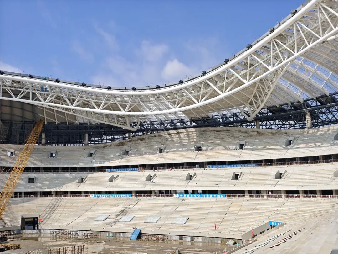 后續(xù)工程穩(wěn)步推進(jìn) 膜結(jié)構(gòu)施工將啟。目前,項目屋蓋鋼結(jié)構(gòu)已全部施工完成,屋面與幕墻結(jié)構(gòu)正同步推進(jìn),建筑輪廓如同 “黃河明珠” 般在黃河之畔熠熠生輝。下一步,施工團(tuán)隊將在看臺上安裝人體工學(xué)觀賽座椅,進(jìn)一步優(yōu)化觀賽舒適度。