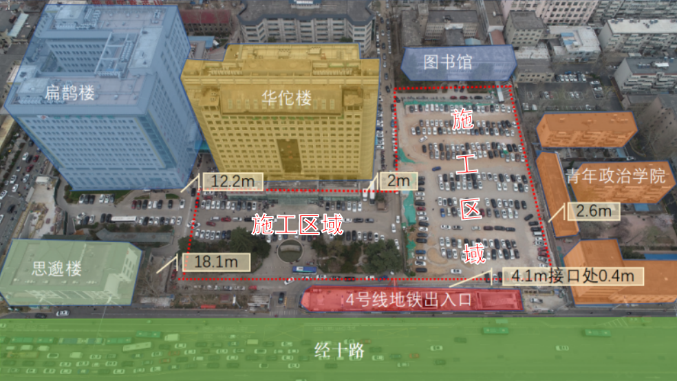 作為國家 “十四五” 重點建設(shè)項目、山東省重點民生工程及國家中醫(yī)疫病防治基地,該項目是中建八局一公司與山東中醫(yī)藥大學(xué)附屬醫(yī)院的第四次攜手合作。項目總建筑面積達(dá) 11.26 萬平方米,涵蓋體檢中心、潔凈手術(shù)、ICU 等多個功能區(qū),規(guī)劃床位 810 張,建成后將為區(qū)域醫(yī)療健康保障注入強勁動力。然而,項目建設(shè)面臨的挑戰(zhàn)堪稱 “極限”:南側(cè)距地鐵出入口僅 4 米,西側(cè)與醫(yī)院華佗樓間距不足 2 米,東側(cè)、北側(cè)被校園環(huán)繞,場地空間極度受限;同時地處濟南富水地層,對噪音控制、揚塵治理及泉脈保護(hù)提出了極高要求。