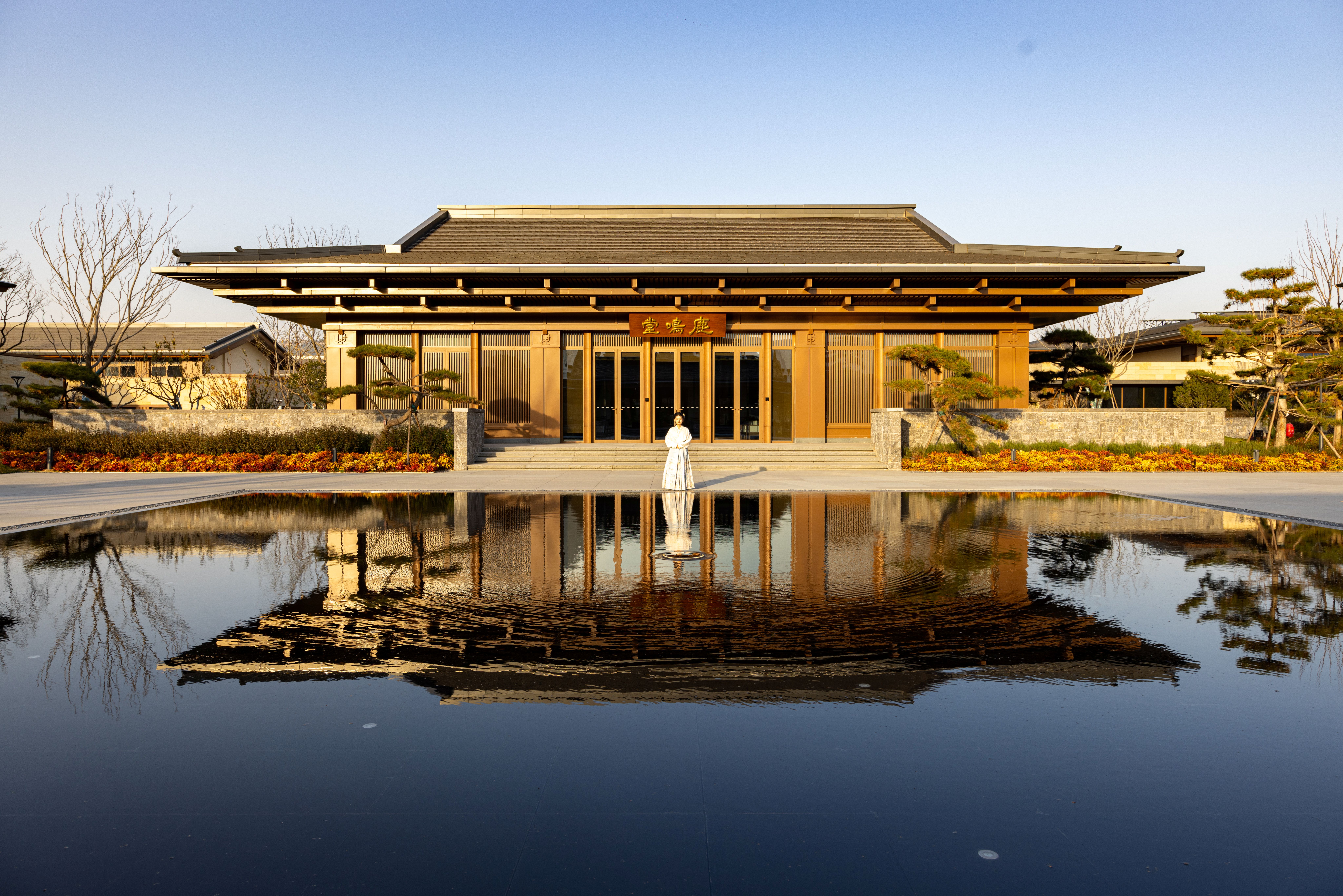 在空間布局上,項(xiàng)目以中軸對(duì)稱的禮序格局,打造“一水、一軸、三階、四園、四院”的空間形態(tài),依托“五畝之宅,百畝之田”的規(guī)劃風(fēng)格,營(yíng)造“山水?村落”人文景觀。建筑順地勢(shì)逐級(jí)而下,巧借尼山與小沂河景致,生動(dòng)詮釋儒家“智者樂(lè)水,仁者樂(lè)山”的山水自然觀。同時(shí),項(xiàng)目以“中軸 + 兩翼”劃分功能空間,中軸串聯(lián)文化體驗(yàn)區(qū)的泮池、鹿鳴堂、大成館,兩翼則分布著交流研學(xué)區(qū)的格致樓、麗澤樓、嘉會(huì)廳、金聲廳、博古樓等建筑,形成廊院遞進(jìn)、景色如畫的格局。