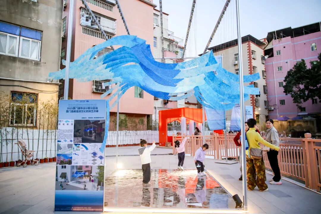 藝術季期間,古寨墻下的裝置復刻海潮律動,3D 打印浪影與竹編漁網(wǎng)交織古今,互動繩墻可編織祈福心愿,天橋上的輕構藝術模擬浪濤起伏,涵洞剪影定格城市流動光影。項目聯(lián)合清華大學、同濟大學等多所高校的設計團隊,以海洋文化、地域記憶與城市共生為靈感,打造了 19 個散落于公共空間的藝術裝置。通過 “巧妙遮蔽外露電箱”“回收塑料瓶”“廢棄的船木再設計” 等方式,將藝術欣賞、空間探索與社區(qū)導覽融為一體。