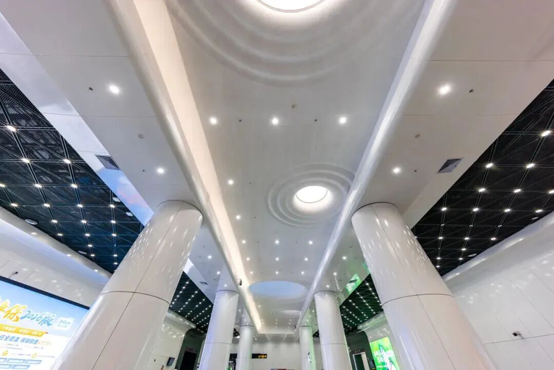 匠心賦能,呈現(xiàn)建筑之美,樞紐天花板采用定制金屬網(wǎng)板,打造開放式結(jié)構(gòu),整體通透率≥70%,巧妙將噴淋煙感、空調(diào)排煙等設(shè)備隱蔽于吊頂上方,燈具精準(zhǔn)排布于單元模塊交接點,實現(xiàn)設(shè)備 “隱形化” 處理,讓天花板兼具功能實用性與視覺簡潔美。