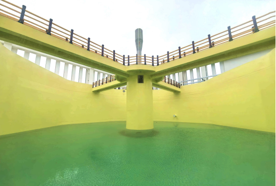 項(xiàng)目養(yǎng)殖池為地上旅游展示結(jié)構(gòu),陸上總水量達(dá) 3.2 萬立方米,相較于傳統(tǒng)埋入地下的池體,防滲漏要求更高、施工難度更大。項(xiàng)目聯(lián)合行業(yè)內(nèi)專家學(xué)者,對(duì)池體混凝土配合比、鋼筋布置開展專項(xiàng)研討與技術(shù)優(yōu)化,有效提升池體成型質(zhì)量和防滲能力,創(chuàng)新采用 “玻璃鋼 + 金湯水不漏 + 環(huán)氧樹脂” 的內(nèi)壁及池底防腐層,管道接縫處增設(shè) 3 毫米厚鍍鋅鋼板,將滲漏等結(jié)構(gòu)擾動(dòng)對(duì)育魚影響降到最低。