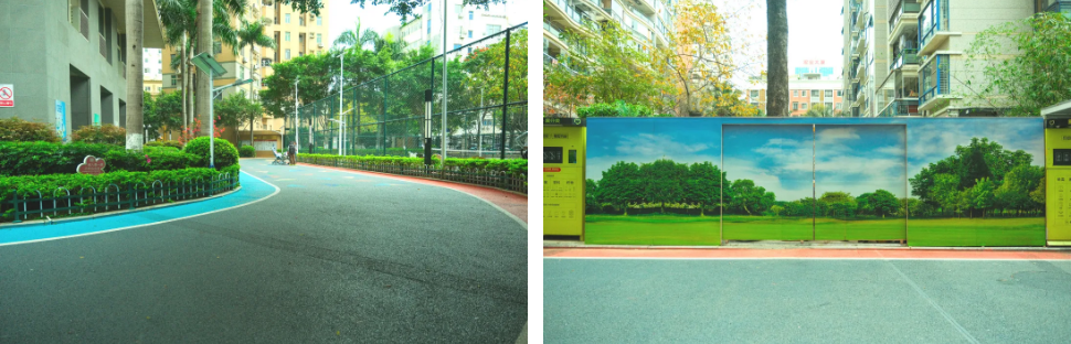 英皇湖畔花苑小區(qū)里,新鋪的塑膠場地平整開闊,垃圾站外墻繪著綠樹藍(lán)天,停車位整齊劃一。