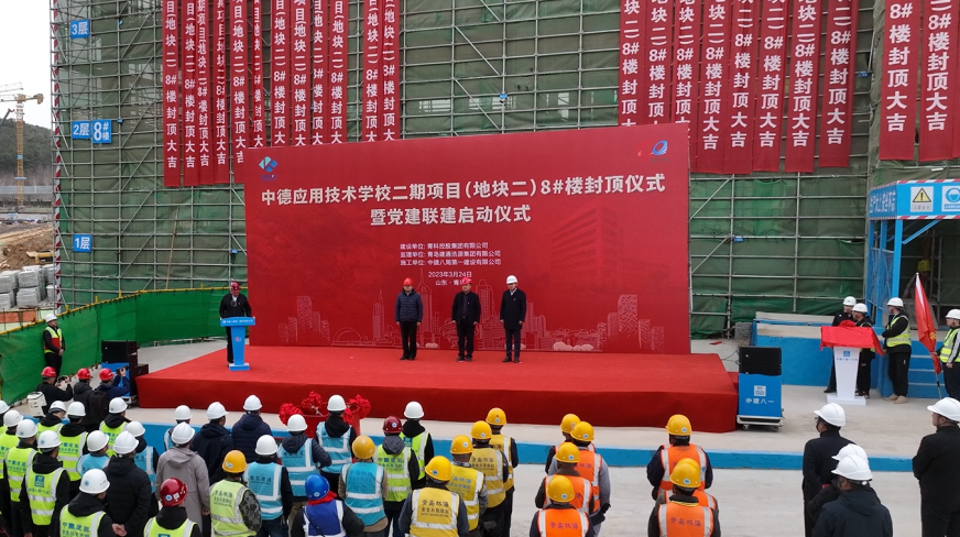 近日,中德應(yīng)用技術(shù)學(xué)校二期項(xiàng)目舉行封頂儀式暨黨建聯(lián)建啟動(dòng)儀式。 青科控股集團(tuán)總經(jīng)理張偉、中德應(yīng)用技術(shù)學(xué)校副校長(zhǎng)丁奉亮、青島建通浩源集團(tuán)總經(jīng)理王建國(guó)、中建八局一公司青島公司相關(guān)負(fù)責(zé)人及施工現(xiàn)場(chǎng)建設(shè)者代表參加。