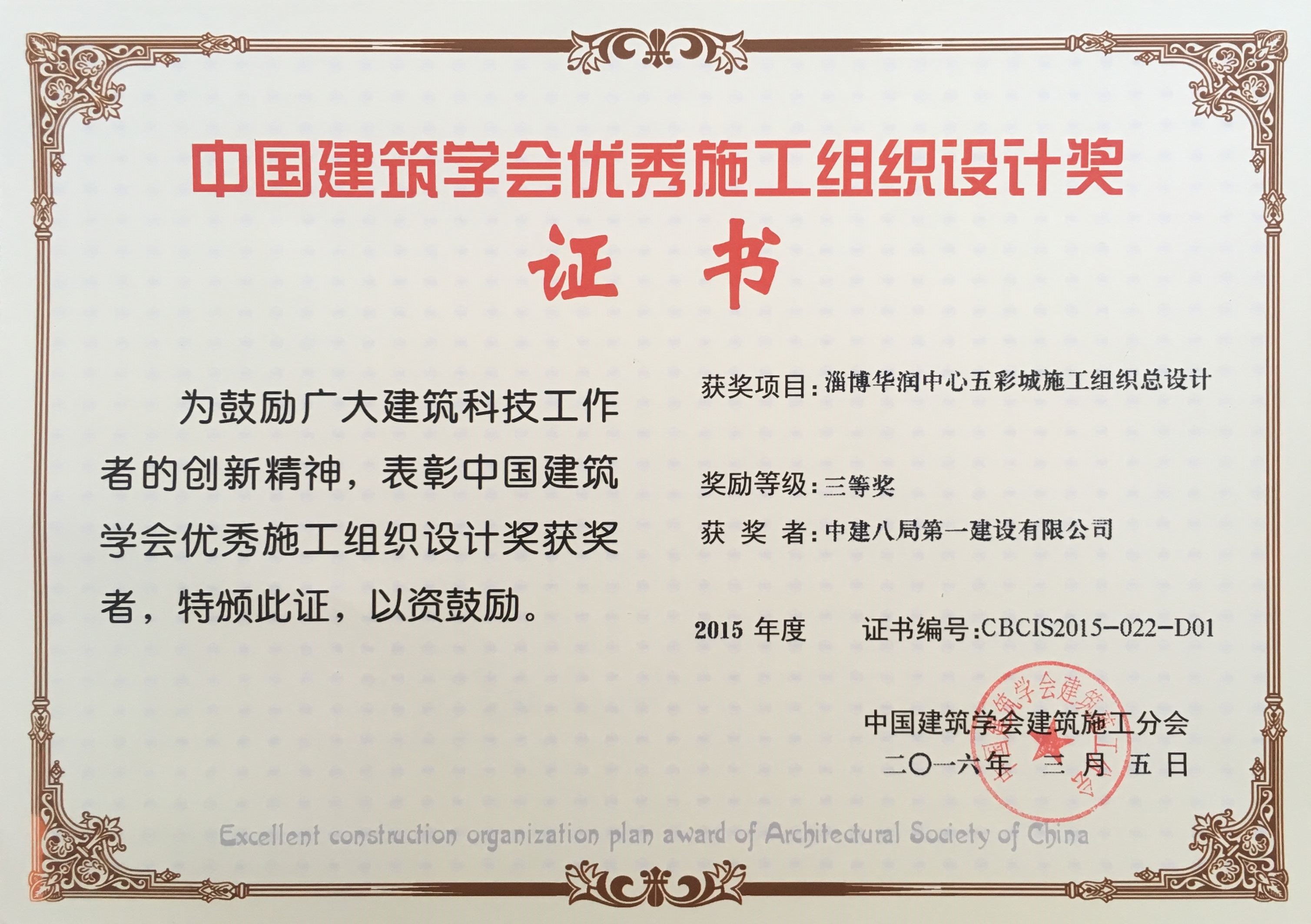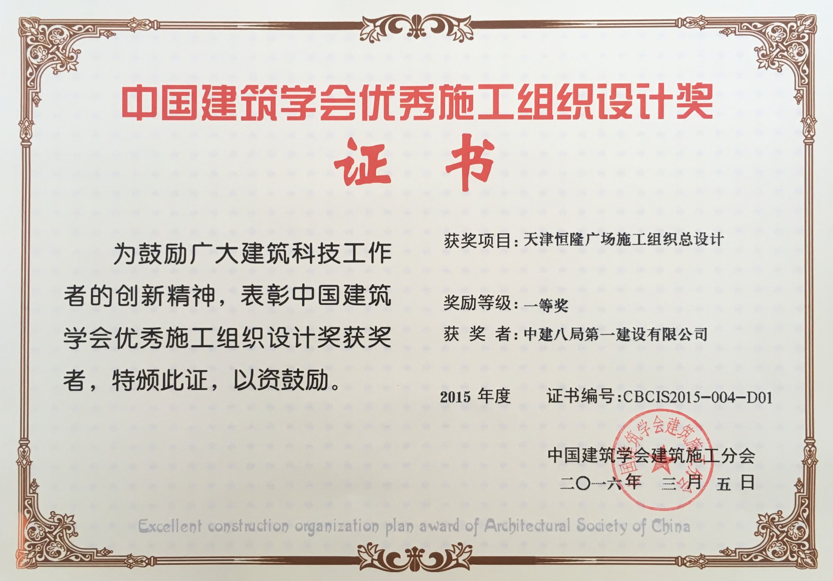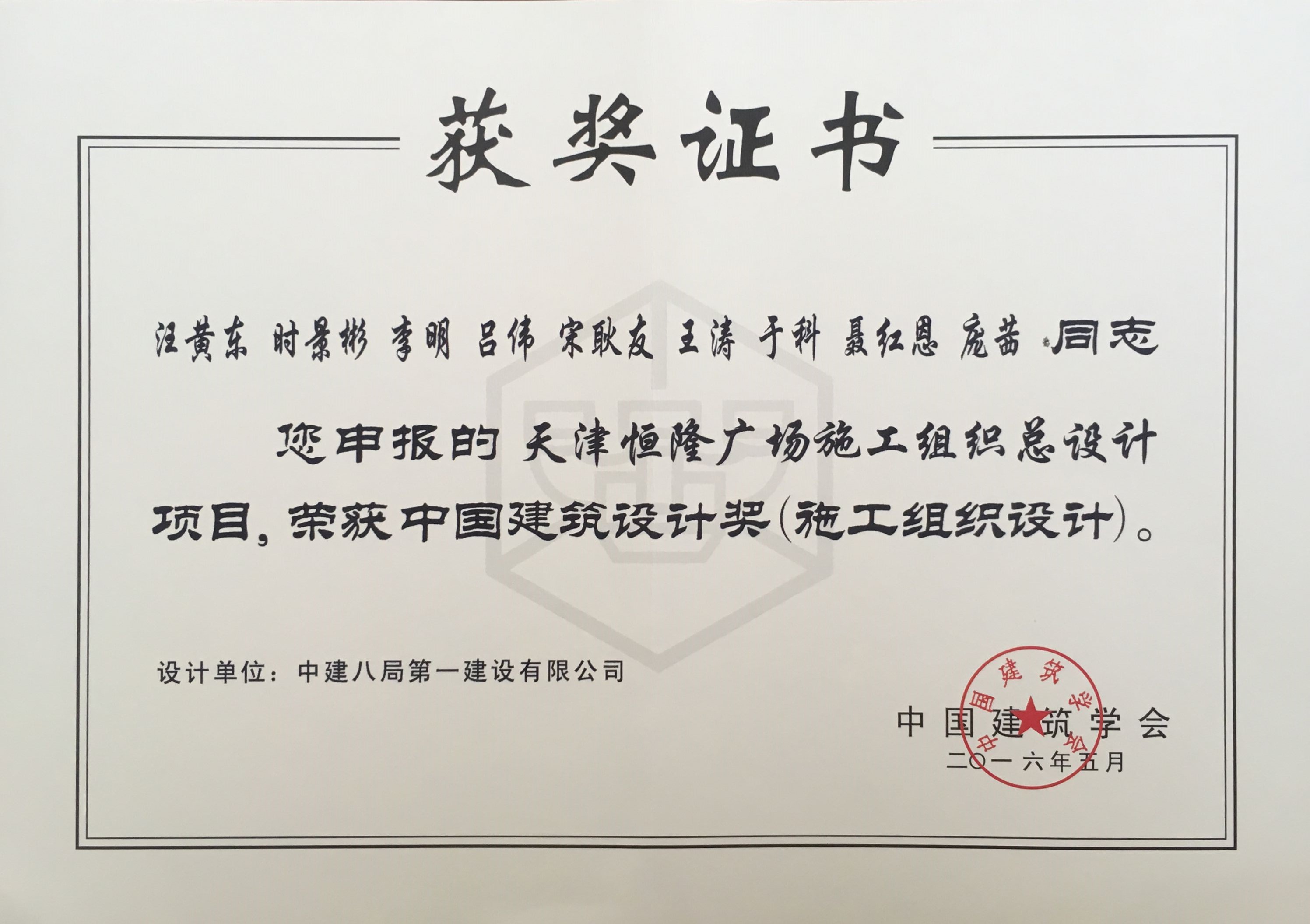 2016年5月18日,2015年度中國建筑設(shè)計獎、中國建筑學(xué)會科技進步獎頒獎會落下帷幕。我公司共榮獲四項中國建筑優(yōu)秀施工組織設(shè)計獎,一等獎二項,二等獎一項,三等獎一項,其中“天津恒隆廣場施工組織總設(shè)計”榮獲中國建筑設(shè)計獎。