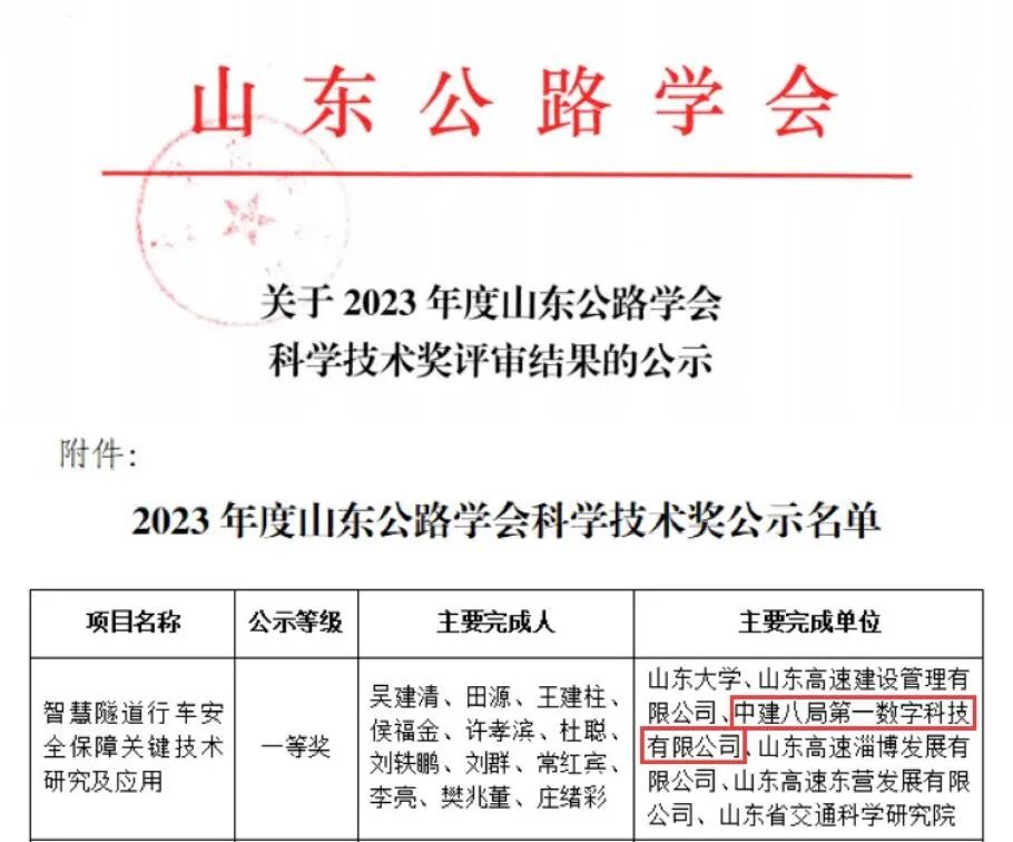 近日,2023年度山東公路學會科學技術獎完成評審結果公示,中建八局第一數字科技有限公司參與的”智慧隧道行車安全保障關鍵技術研究與應用”科技創(chuàng)新項目獲評山東公路學會科學技術獎一等獎。