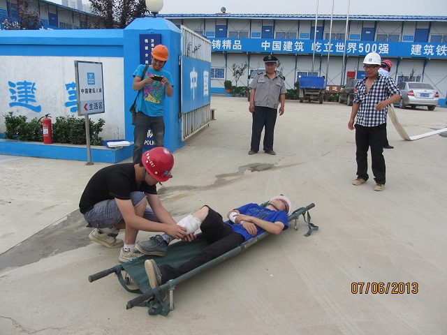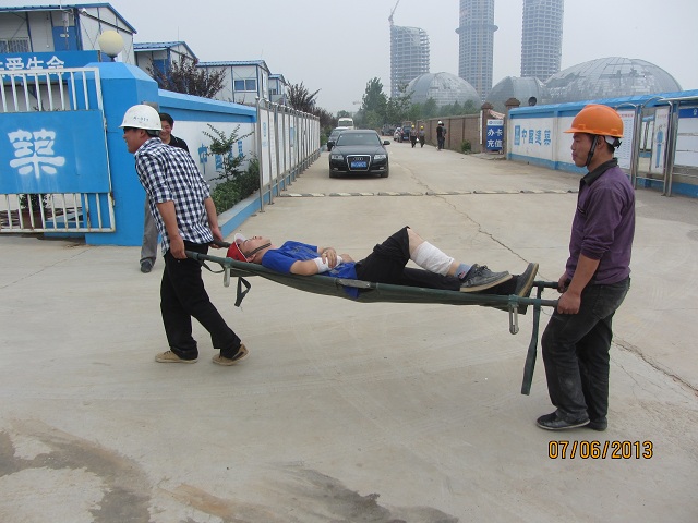 在工人生活區(qū)假設(shè)一個失火點(diǎn),進(jìn)行現(xiàn)場模擬演練。事先準(zhǔn)備了干粉滅火器、消防水帶、急救箱、擔(dān)架等應(yīng)急救援物資,由義務(wù)消防組組長韓成寶負(fù)責(zé)現(xiàn)場指揮,根據(jù)事先安排,在接到救火命令后,由離失火點(diǎn)最近的工人使用干粉滅火器進(jìn)行初期滅火,待義務(wù)消防小組趕到現(xiàn)場后再用消防水進(jìn)行后期撲救,然后應(yīng)急救援小組模擬救援受傷的工人,進(jìn)行簡單的包扎處理后用擔(dān)架抬離現(xiàn)場。由于分工明確,指揮得到,演習(xí)十分順利。