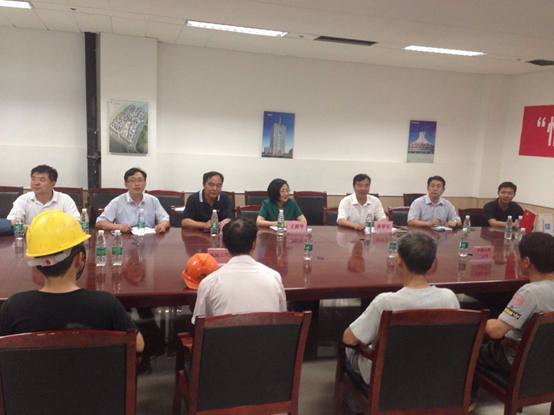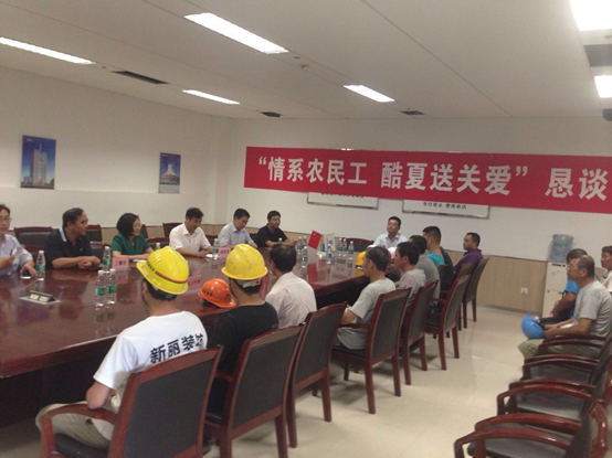 8月5日,濟南市人社局局長王擁華、濟南市勞動就業(yè)辦公室主任黃厚安等領(lǐng)導蒞臨濟南分公司銀豐財富廣場項目,為農(nóng)民工兄弟帶來了洗化等防暑降溫用品,并舉行了“情系農(nóng)民工、酷夏送關(guān)愛”懇談會。