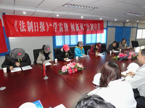 宣傳小組通過(guò)座談、問(wèn)答、發(fā)放普法材料、法制宣傳教育等形式,大力弘揚(yáng)新時(shí)代雷鋒精神以及社會(huì)主義核心價(jià)值觀,進(jìn)一步提高了廣大員工及工人的思想道德素質(zhì)和法律意識(shí)。