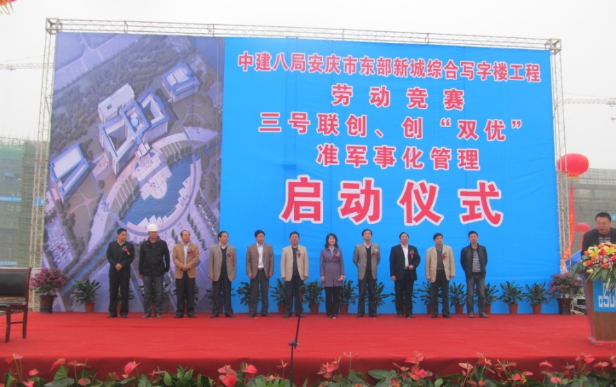 10月28日上午10點18分,安慶市東部新城綜合寫字樓項目隆重舉行勞動競賽、“三號聯(lián)創(chuàng)”、創(chuàng)“雙優(yōu)”暨準軍事化管理試點活動啟動儀式。安慶市人民政府副秘書長程天舒,安慶市質量監(jiān)督站站長張令軍、安慶市建管處副主任吳多華、安慶市市政府研究室主任吳邦本,公司黨委書記許紅,副總經(jīng)理張思印、紀委書記薛樹海及項目部全體員工參加了活動。