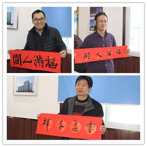 1月14日,公司濟(jì)南中央商務(wù)區(qū)安置區(qū)(CBD)項(xiàng)目熱鬧非凡。山東省青年書協(xié)常務(wù)副主席李成軍,省青年書協(xié)副主席兼秘書長(zhǎng)黨現(xiàn)強(qiáng),省青年書協(xié)副秘書長(zhǎng)、山東財(cái)經(jīng)大學(xué)副教授王子庸,省青年書協(xié)理事、市青年書協(xié)副主席王奇嵩四位書法家及公司書法協(xié)會(huì)成員徐偉、吳天均、張廣超,現(xiàn)場(chǎng)揮毫,一刻不得閑,一條條寫有新春祝福的對(duì)聯(lián),散發(fā)著清新墨香,一張張桌子前人頭攢動(dòng)。 230名來(lái)自濟(jì)南、安裝、基礎(chǔ)設(shè)施、裝飾四家二級(jí)單位在建項(xiàng)目的建筑工人,一邊誦讀著新春祝福,一邊嘖嘖稱贊,一張張笑臉洋溢著“帶幅春聯(lián)回家過(guò)年”的幸福憧憬?,F(xiàn)場(chǎng)嘉賓們忙著為建筑工人發(fā)放棉被,也紛紛對(duì)公司的“暖冬”策劃點(diǎn)贊。