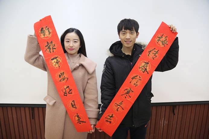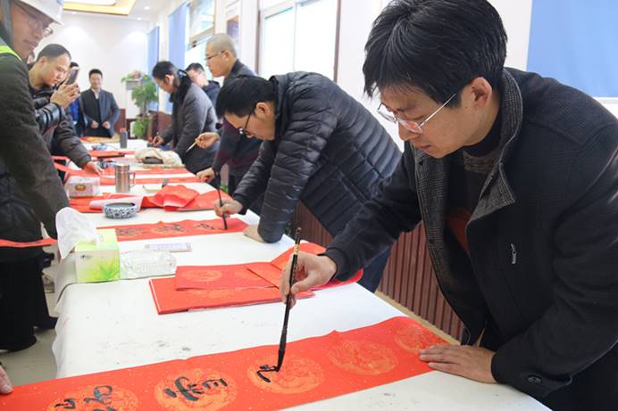 “看,書法家們正揮毫潑墨書寫新春的祝福”
