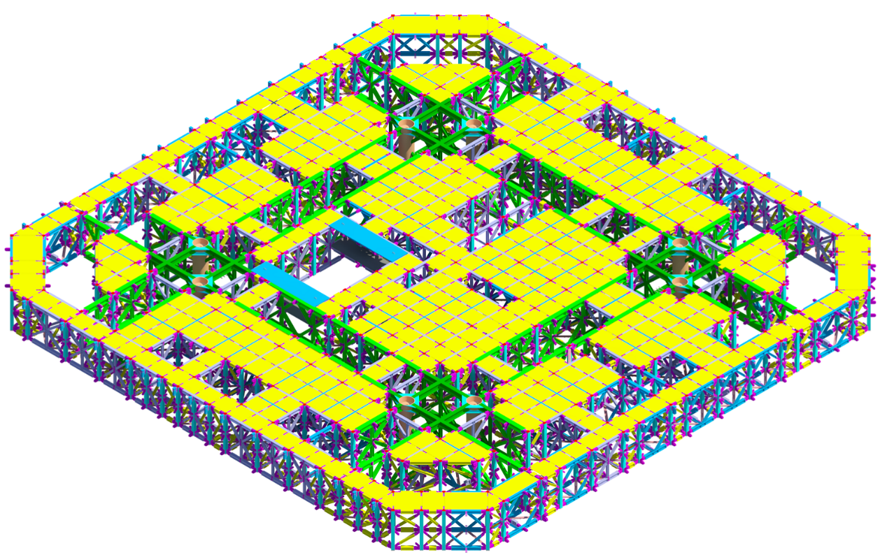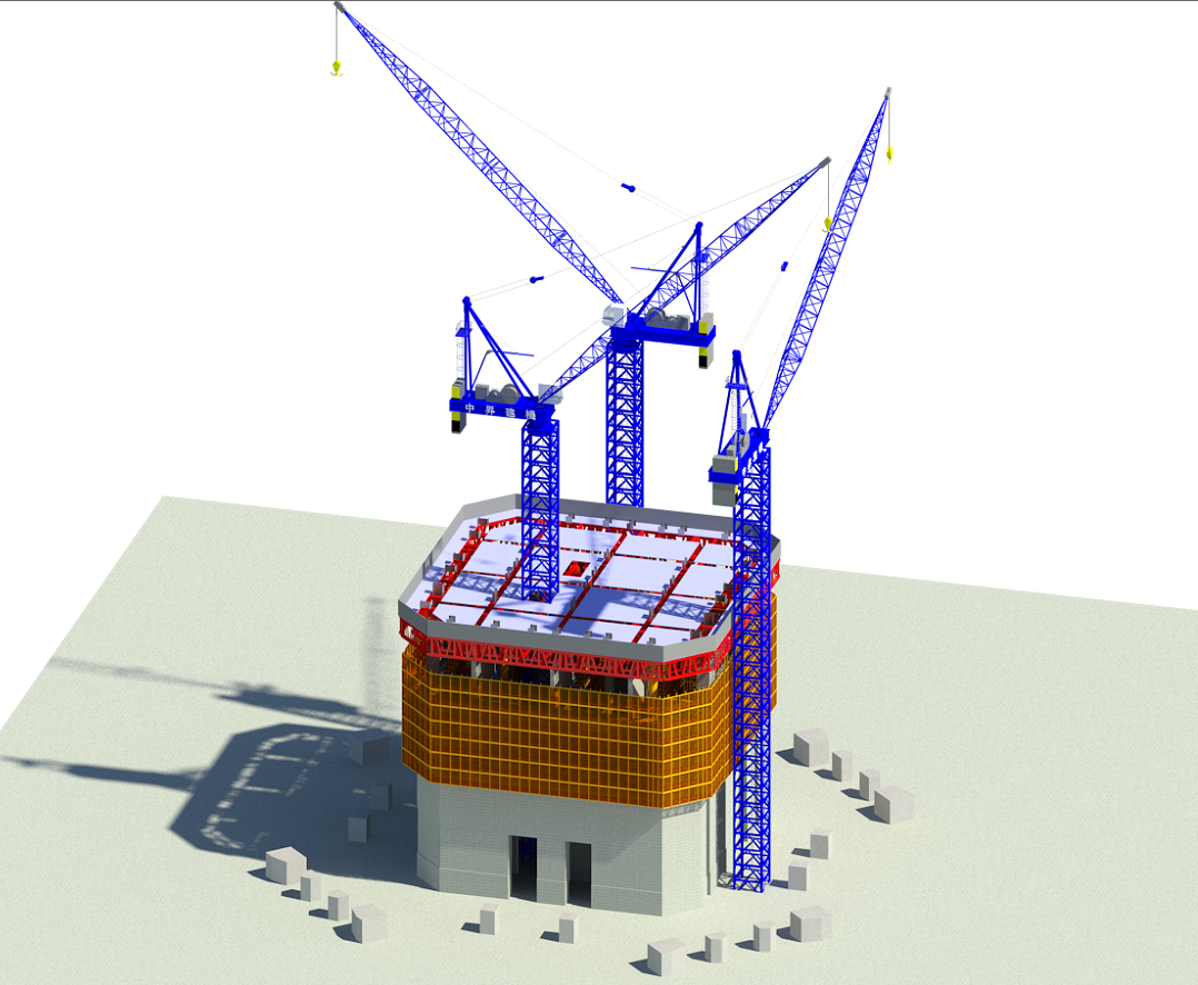 項目因此計劃研發(fā)智能化整體提升平臺施工。該頂升平臺能夠?qū)崿F(xiàn)施工集成,將施工電梯直達(dá)平臺、卸料平臺、混凝土布料溜管、臨時設(shè)施、物料堆場等與平臺的融合,優(yōu)化資源配置,減少設(shè)備之間運行的干擾,提升施工速度;利用墻體預(yù)埋鋼盒,油缸支撐系統(tǒng)附著墻體,保證平臺承載力,同時可抵御高空風(fēng)荷載作用。通過優(yōu)化設(shè)計,外掛架開合伸縮機(jī)構(gòu),解決墻體內(nèi)收、傾斜、伸臂桁架、預(yù)埋附墻件等復(fù)雜情況下的平臺爬升;全方位實時監(jiān)控平臺工作運行狀態(tài),具有預(yù)警功能。