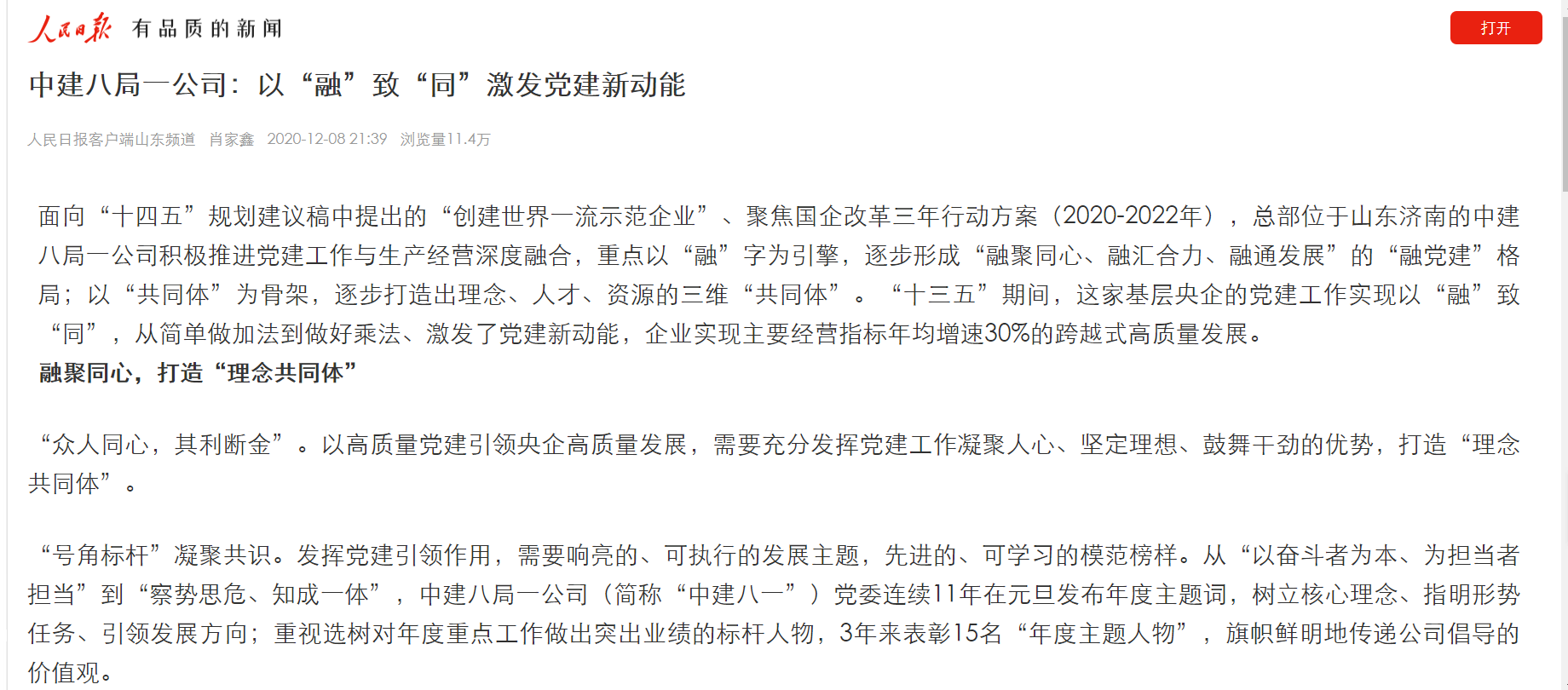 12月8日,《人民日?qǐng)?bào)》客戶端以《中建八局一公司:以“融”致“同”激發(fā)黨建新動(dòng)能》為題,全文刊發(fā)公司“融黨建”工作的經(jīng)驗(yàn)做法,瀏覽量很快突破10萬(wàn)+。 截至目前,公司黨委共有在職黨員1600余名,下設(shè)3個(gè)二級(jí)黨委、11個(gè)黨總支、183個(gè)黨支部。